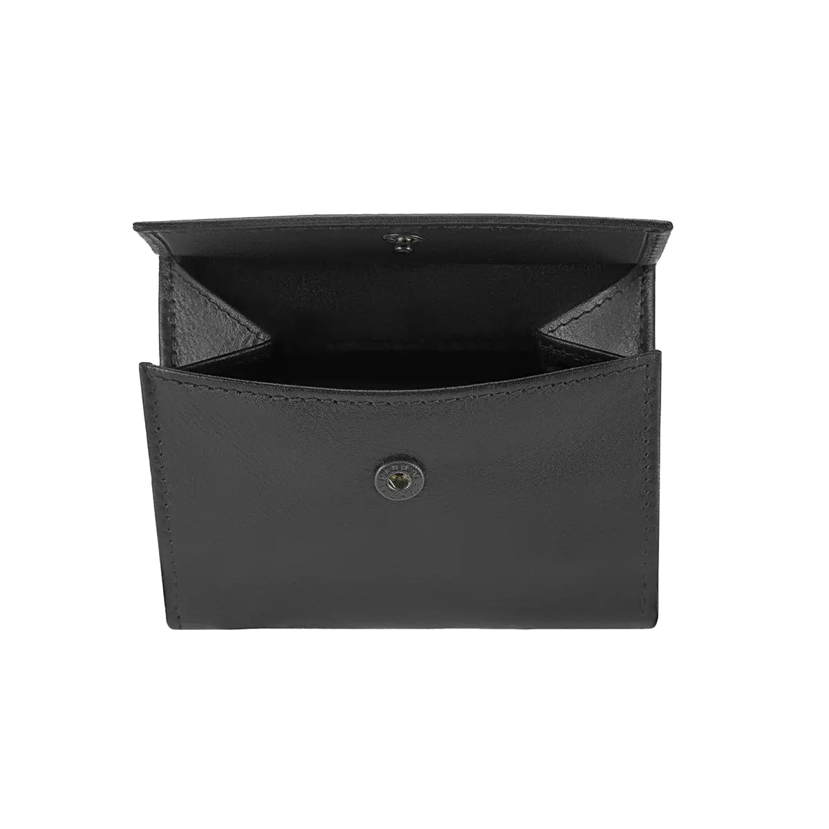 “Carteira pequena de homem em pele com proteção anti-RFID e bloqueio NFC. Contém 1 compartimento para notas, 6 compartimentos para cartões e porta-moedas. Coleção Prisma.