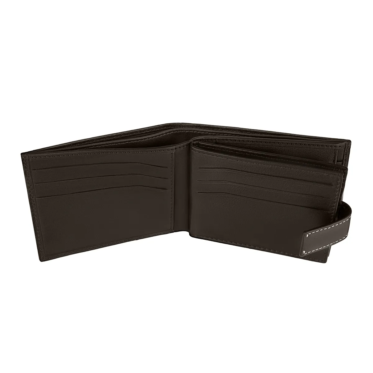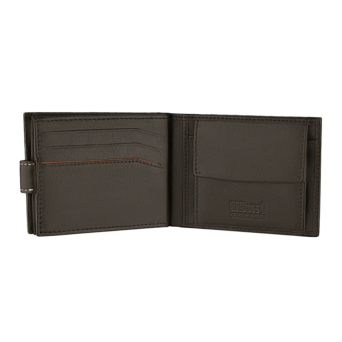“Carteira de homem em pele, com proteção anti-RFID e bloqueio NFC. Contém 2 compartimentos para notas, 12 compartimentos para cartões, 1 compartimento para documentos ou fotos, 3 compartimentos multiusos e 1 porta-moedas. Fecha com presilha. Coleção Elite.