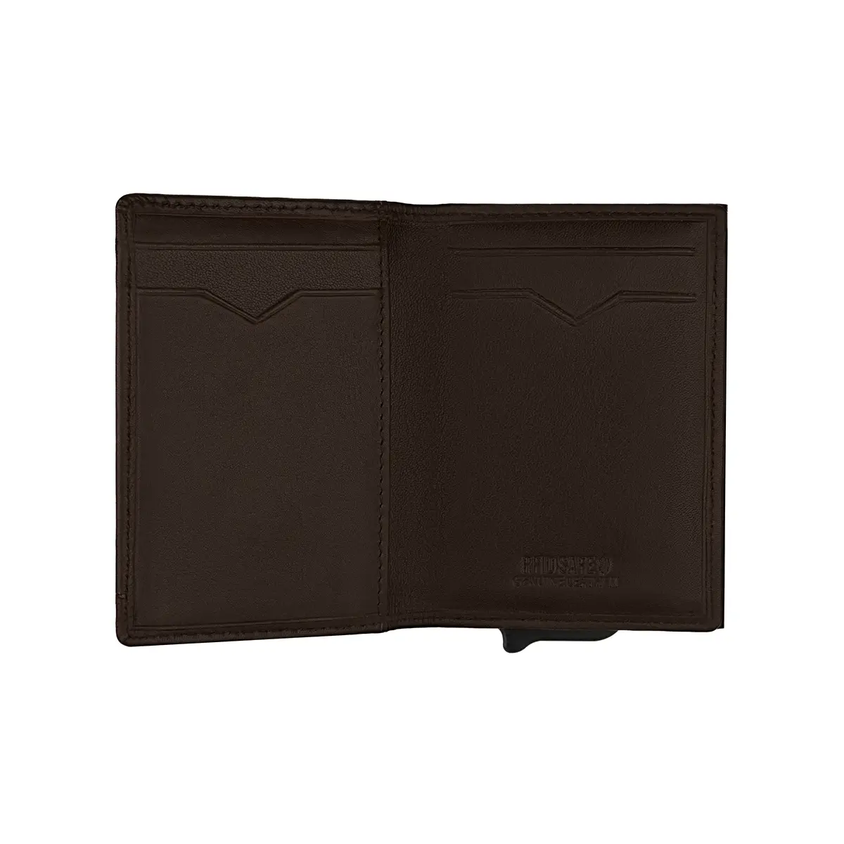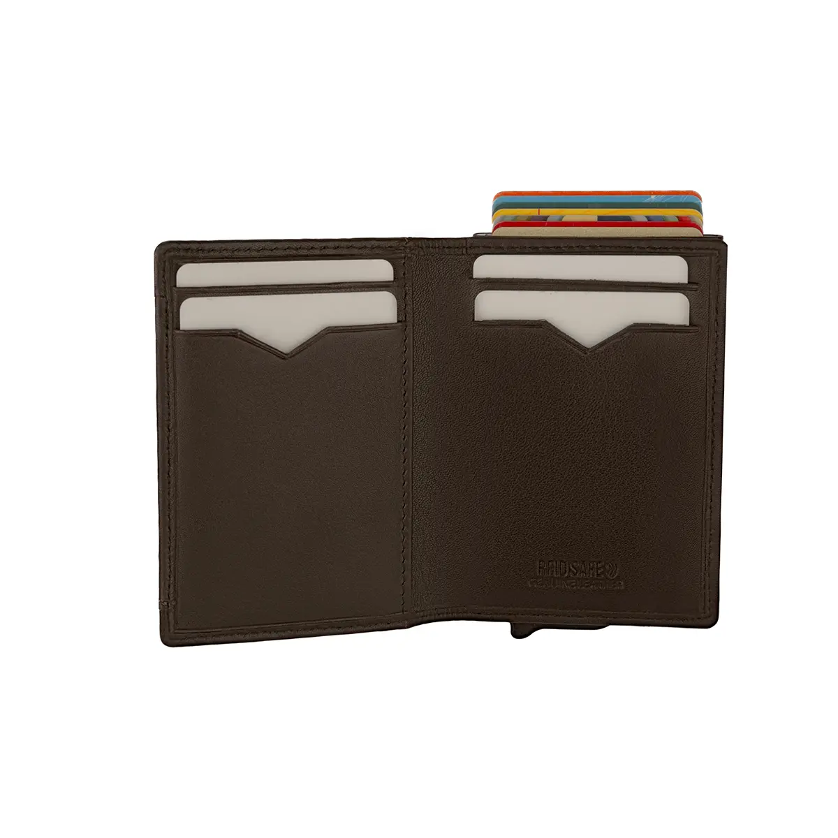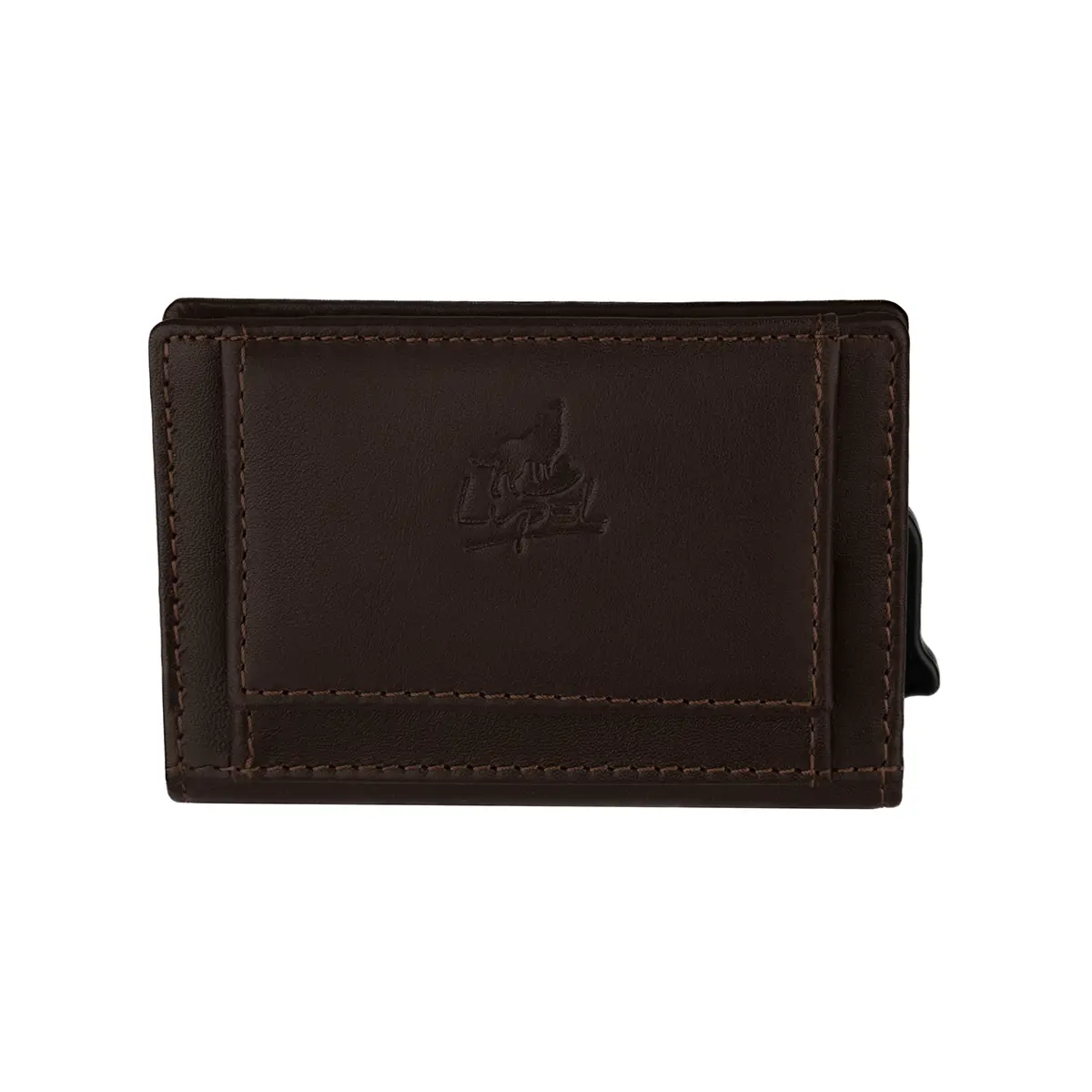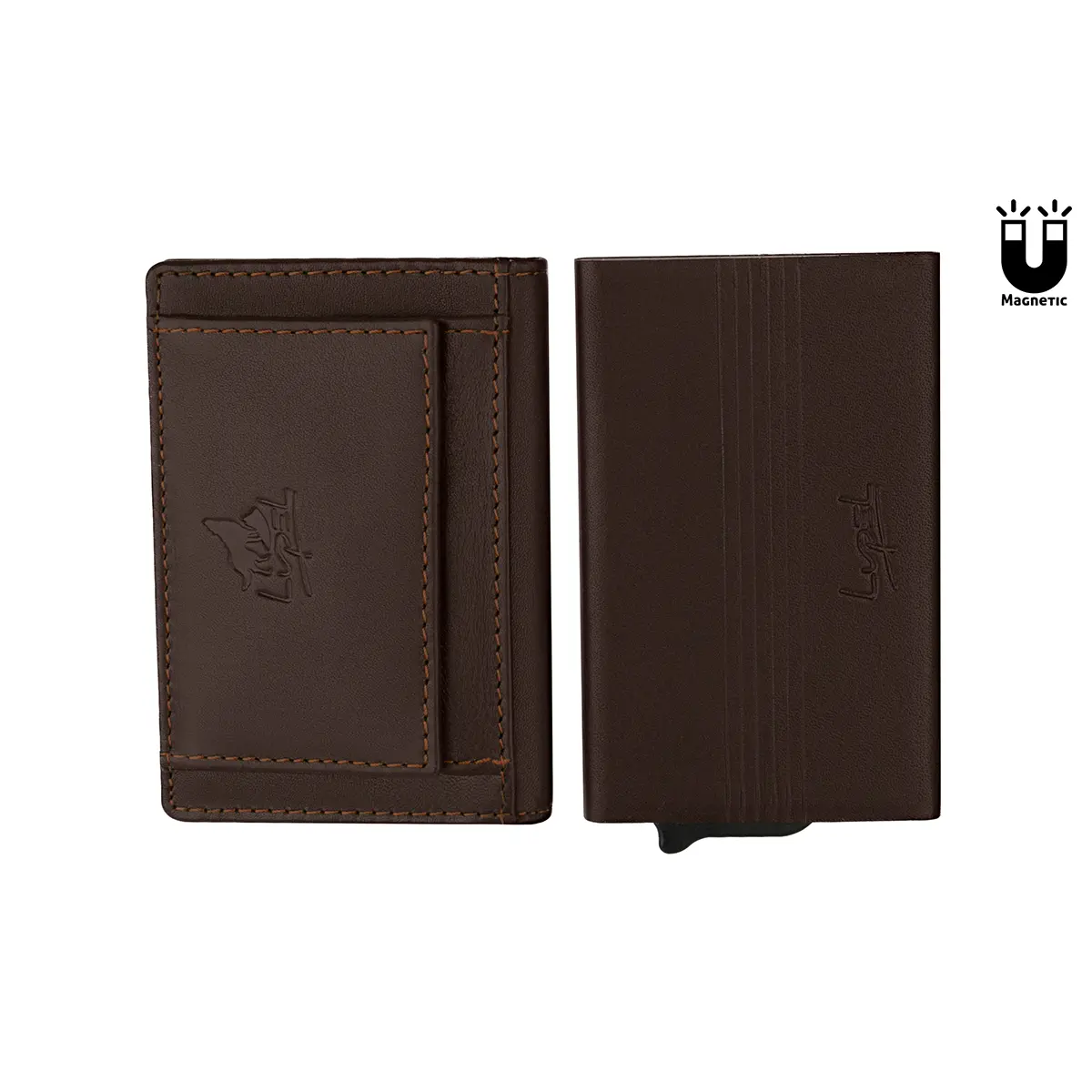 “Porta-cartões em pele e caixa metálica em pele e alumínio 2 em 1.